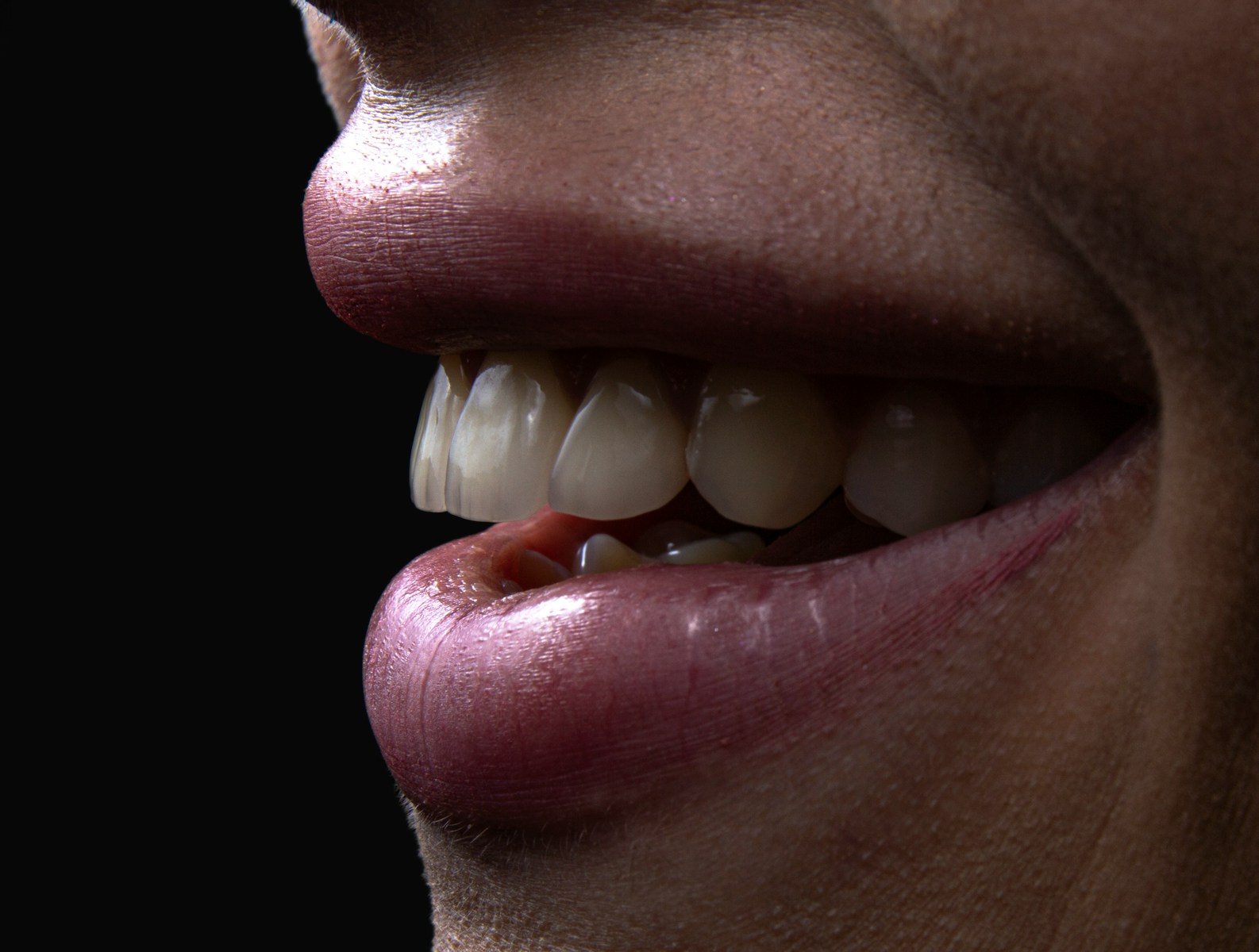 a person's mouth with teeth and a group of white balls
