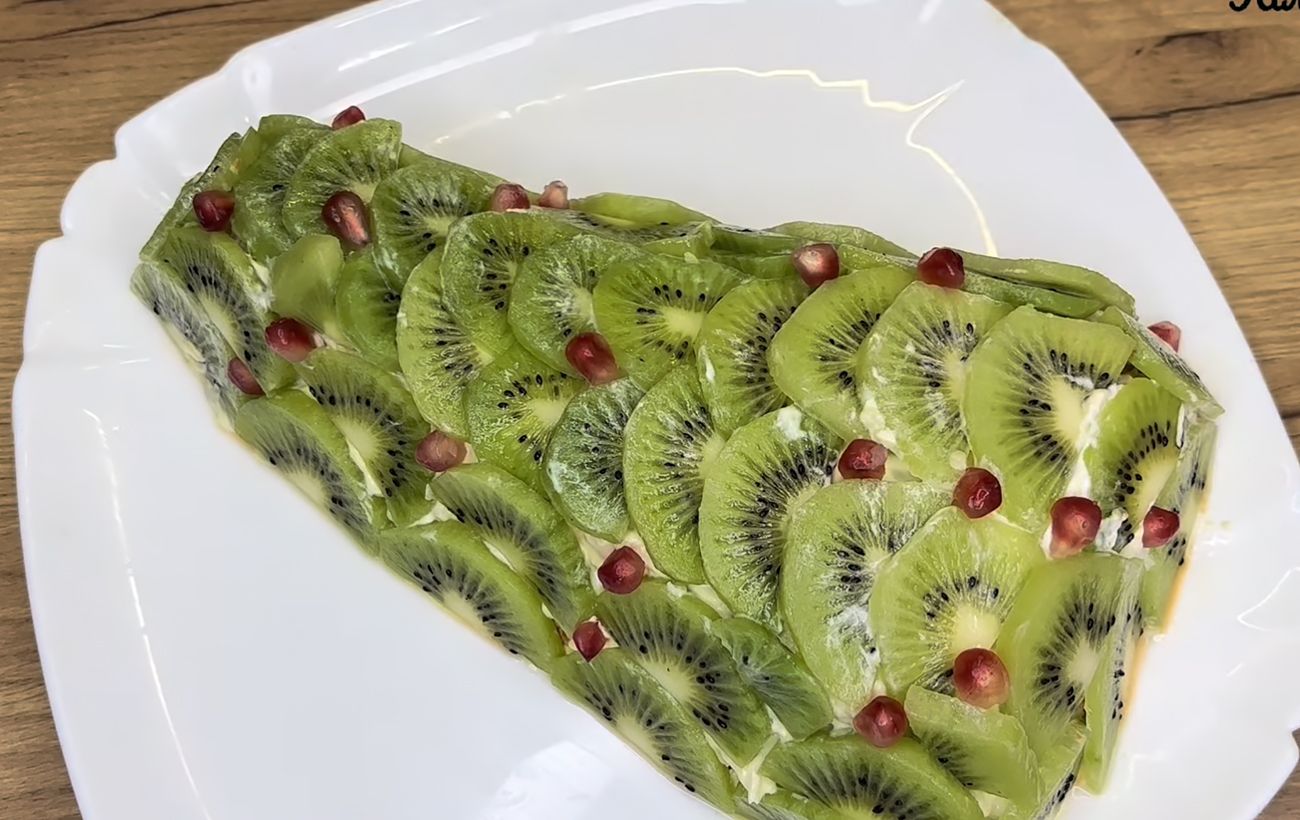 Pabaigoje dar kartą užtepkite majonezo ir išdėliokite plonais pusmėnuliais supjaustytą kivį taip, kad būtų visiškai uždengtas viršutinis sluoksnis ir dar labiau išryškėtų eglės forma.
