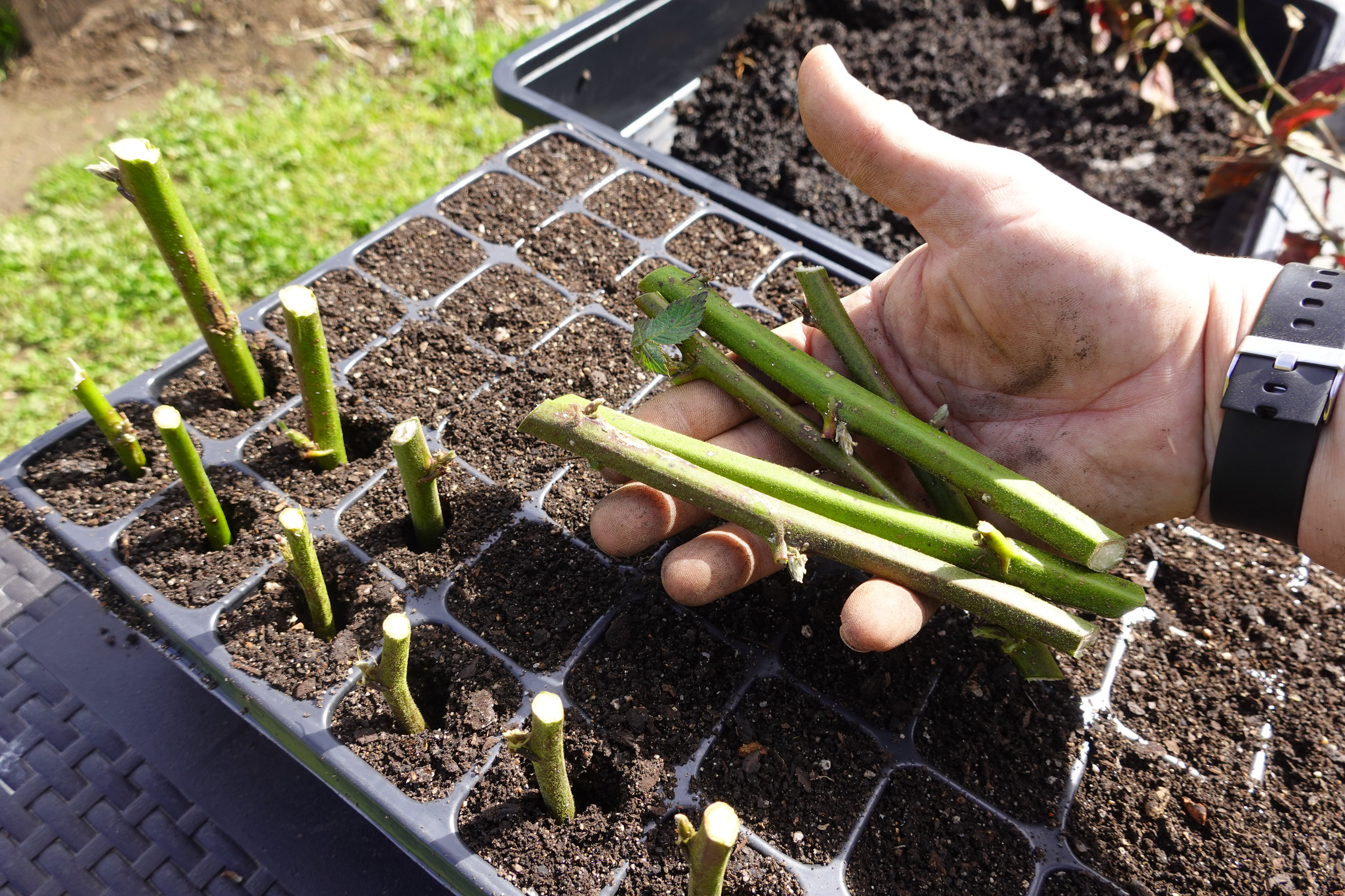 Vazonėliai laikomi šviesioje, bet vėsioje vietoje, o žemė reguliariai drėkinama, kad neišdžiūtų. Svarbu neperlaistyti, nes per didelė drėgmė gali sukelti puvinį. Per kelis mėnesius auginiai pradeda leisti šaknis, o per metus virsta tvirtais jaunais augalais.