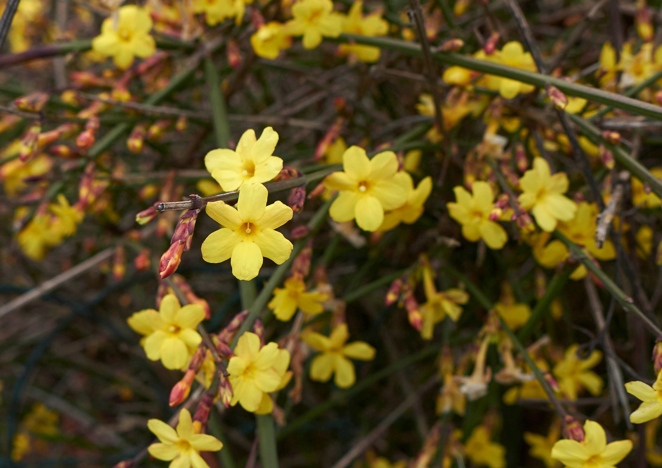 Spalvingiausias periodas prasideda spalį, kai jazminas ima krauti smulkius, auksinius žiedus. Priklausomai nuo oro sąlygų, žydėjimas gali tęstis iki pat balandžio. Žiedpumpuriai labai atsparūs šalčiui ir gali ištverti iki –19 °C, o pilnai prasiskleidę žiedai išlaiko iki maždaug –5 °C šaltį.