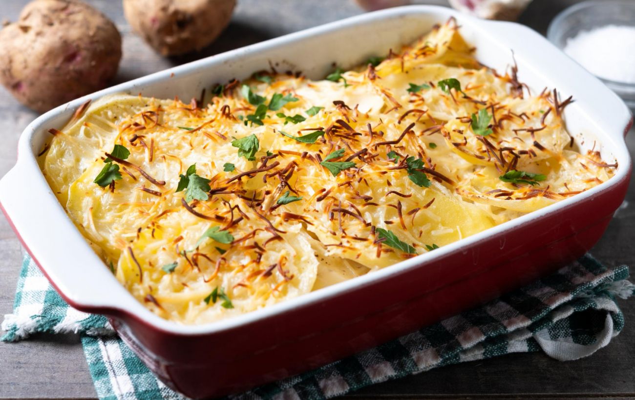 Ši bulvių apkepo versija yra paprasta, bet kartu išties gardi. Pagrindą sudaro plonais griežinėliais supjaustytos bulvės, o kreminį skonį suteikia lengvas padažas iš pieno, miltų ir aromatingų prieskonių. Viską užbaigia aukso spalvos sūrio plutelė, susidarantį apkepą paskutinėmis kepimo minutėmis.
