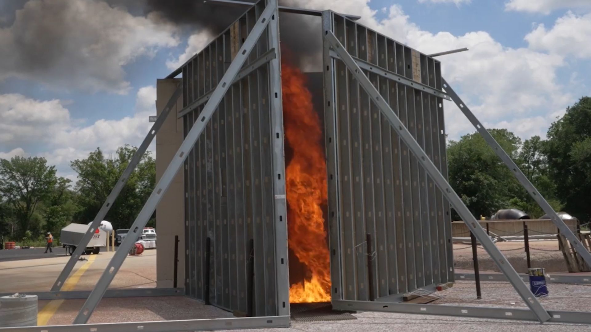 Tyrėjai pastatė 5,2 m aukščio trijų sienų trikampę konstrukciją, skirtą tiksliai kontroliuoti oro srautus aplink 1,5 m skersmens žaliavinės naftos baseiną.