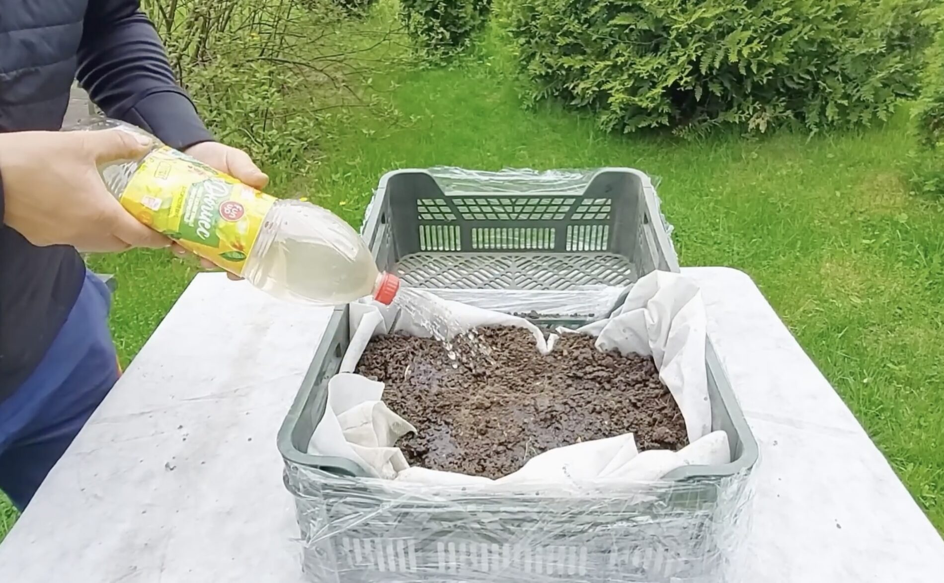Antra dėžė taps jūsų „lysvės“ dalimi. Kad žemė neiškristų pro dugne esančias skylutes, ją reikėtų iškloti agroplėvele arba kitu po ranka turimu panašios paskirties audiniu. Tuomet į tokią paruoštą dėžę galima berti žemę ir sodinti daigus ar sėti sėklas.
