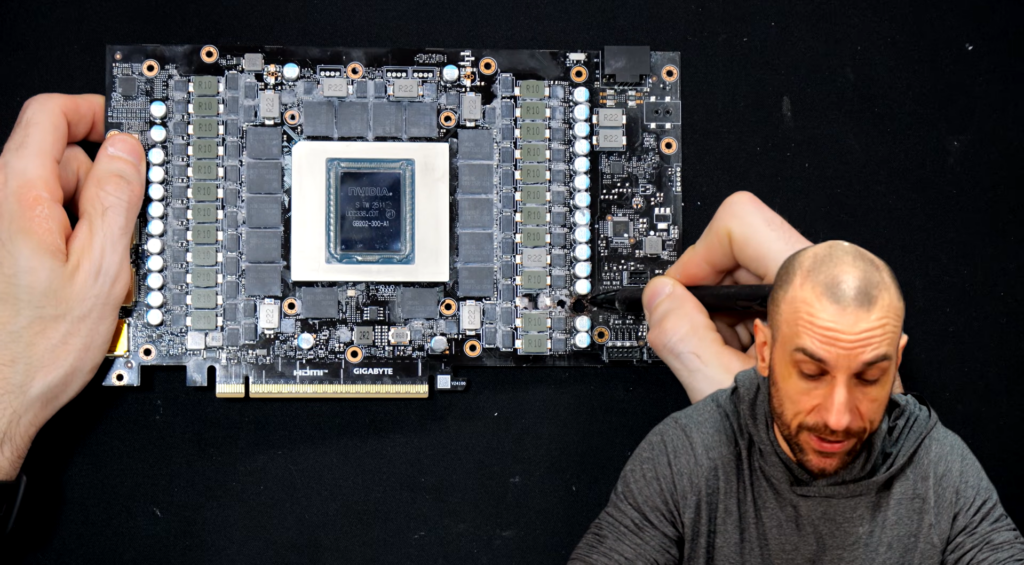 Tai nebuvo vienintelė modifikacija. Jis taip pat atliko šunto rezistoriaus modą – gerai žinomą (ir rizikingą) pakeitimą, leidžiantį apeiti „Nvidia“ įdiegtus galios apribojimus. Tikslas buvo paprastas: leisti GPU naudoti gerokai daugiau energijos, nei leidžia gamykliniai nustatymai.
