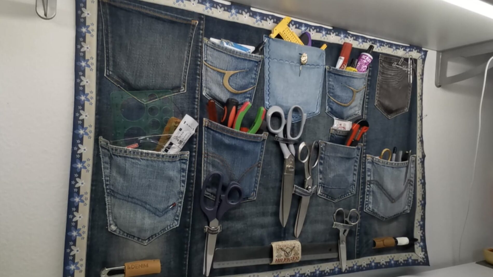 Vienas paprasčiausių būdų panaudoti senus džinsus – iš jų pasidaryti sieninį įrankių laikiklį. Galinės džinsų kišenės jau yra tarsi mažos saugojimo vietos, todėl jas lengva pritaikyti smulkiems daiktams laikyti. Toks sprendimas padeda palaikyti tvarką darbo vietoje.