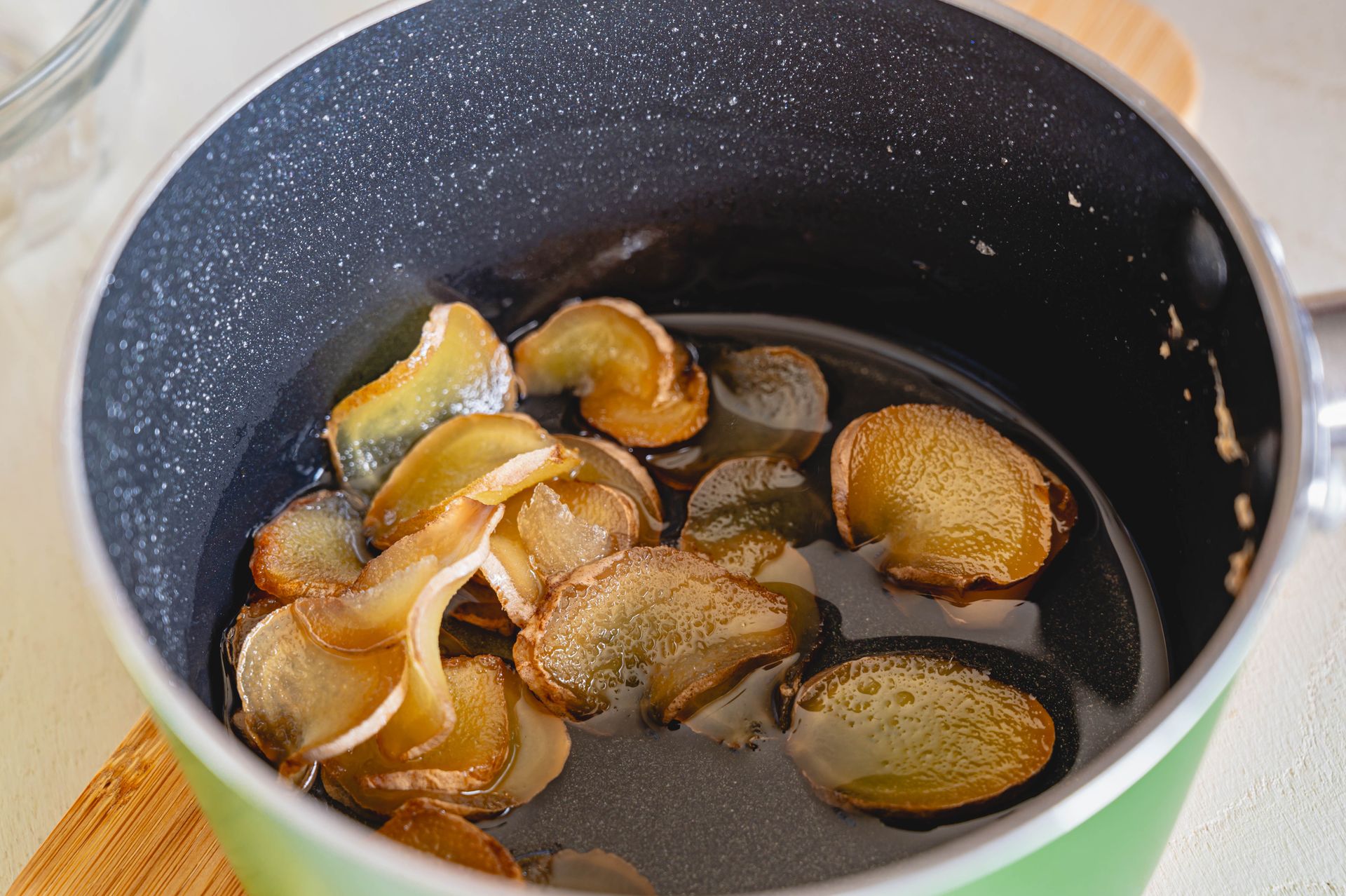 Nereikia labai stipraus nuoviro. Pakanka gabalėlio šviežio imbiero (apie 2–3 cm), supjaustyto plonais griežinėliais arba lengvai sutarkuoto ir užpilto karštu vandeniu. Gėrimą galima pritraukti 8–10 minučių, uždengus puodelį ar arbatinuką. Jei mėgstate intensyvesnį skonį, imbierą galite kelias minutes lengvai pavirti ant silpnos ugnies.