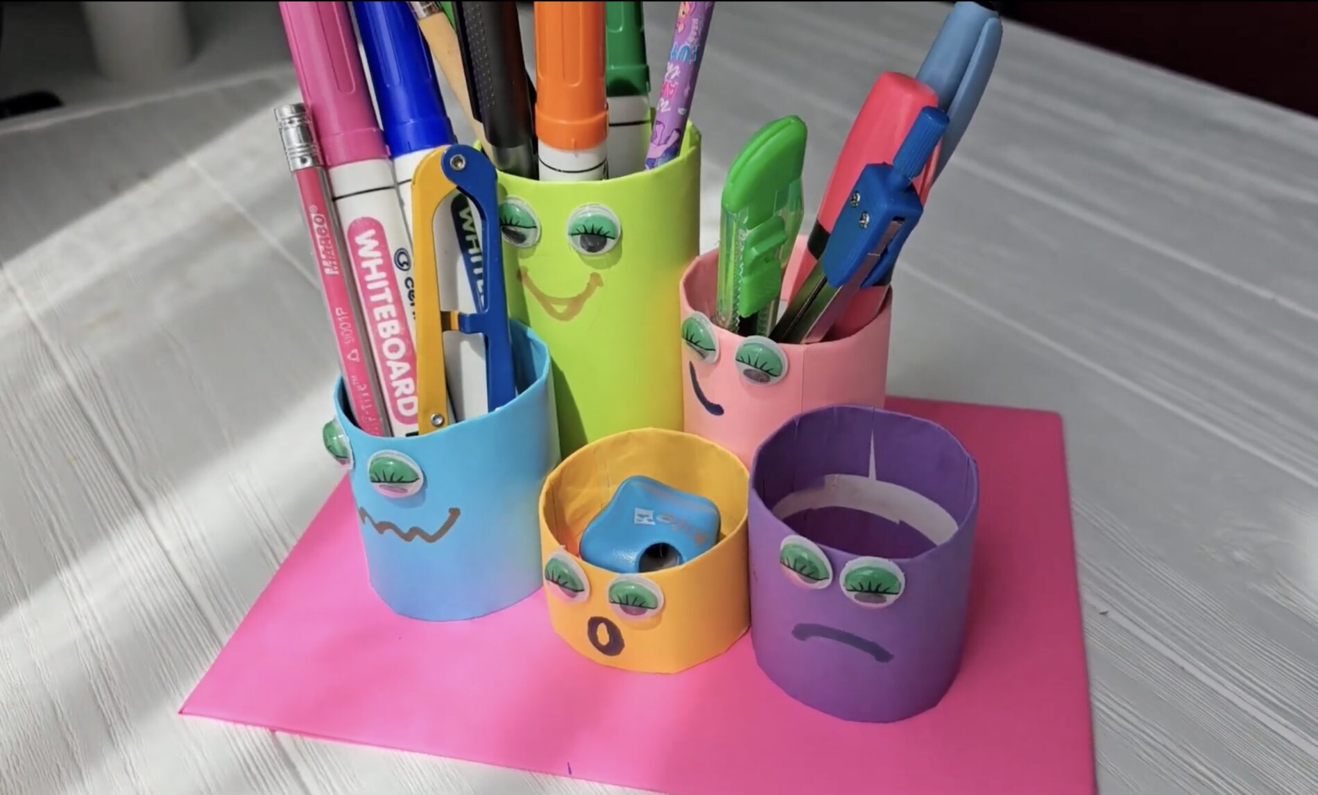 Po to klijais ištepkite kiekvieno ritinėlio dugną ir tvirtai prispauskite prie kartono pagrindo. Leiskite klijams visiškai išdžiūti – ir jūsų ryškus, žaismingas bei praktiškas smulkmenų organizatorius jau paruoštas naudojimui.